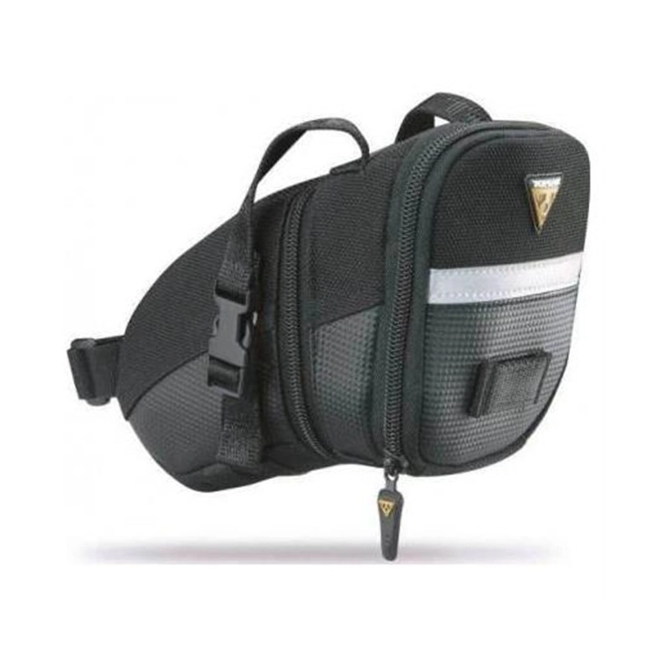 Bolsa bajo sillín. Bolsa portaobjetos aerodinámica que se coloca debajo del sillín. Dispone de cremallera de expansión tipo fuelle, y está fabricada en Poliester 1200 Denier. Se puede montar una luz y tiene material reflectante a 3m para una mejor visibilidad de noche. Anclaje tradicional con cintas de Nylon y Red·Lite clip. Capacidad entre 1,48 y 1,97 litros. Dimensiones 20 x 11 x 12 cm. Peso 130gr. Para cicloturistas previsores que llevan siempre el kit básico de "supervivencia mecánica".