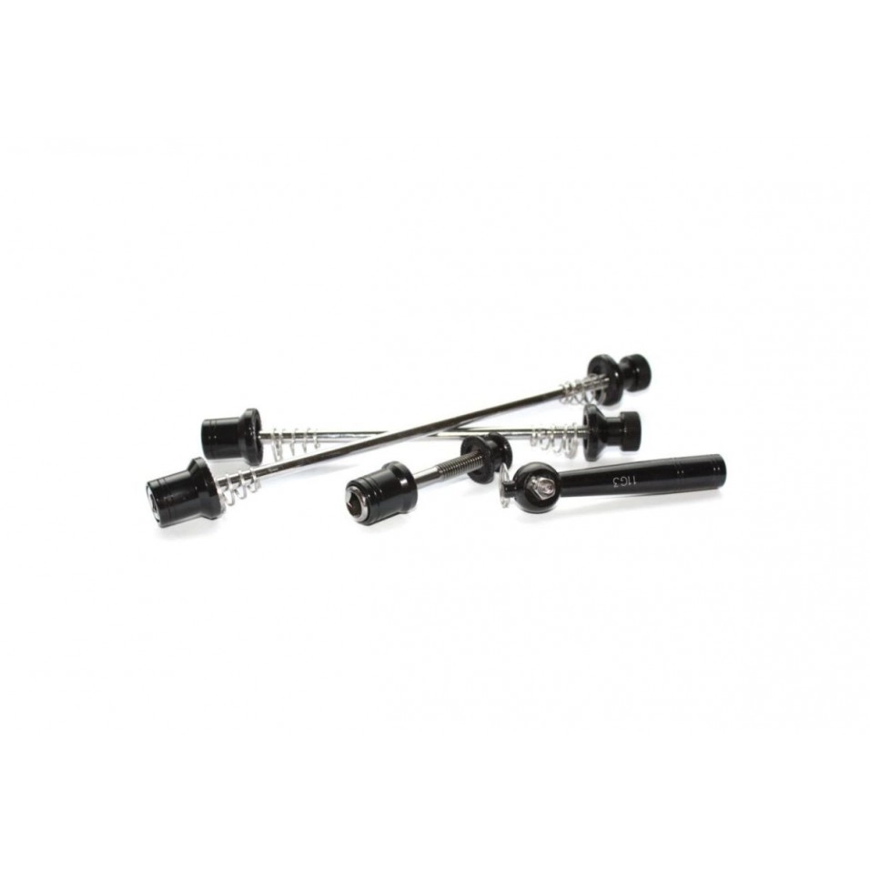 Todos los complementos que necesites de las mejores marcas los tienes en Escapa. Kit de cierres rápidos antirrobo de la marca alemana Point. El juego incluye cierre para rueda delantera y trasera y cierre para la tija del sillín con llave específica para su apertura, de esta manera tus ruedas y sillín estarán a salvo.